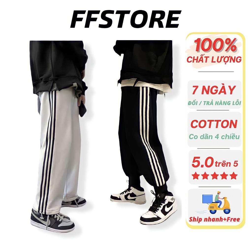 Freeship- Quần ống rộng 3 sọc nam nữ có dây rút vải thun cotton thể thao 4 chiều form jogger dáng suông FFSTORE mua tại đây